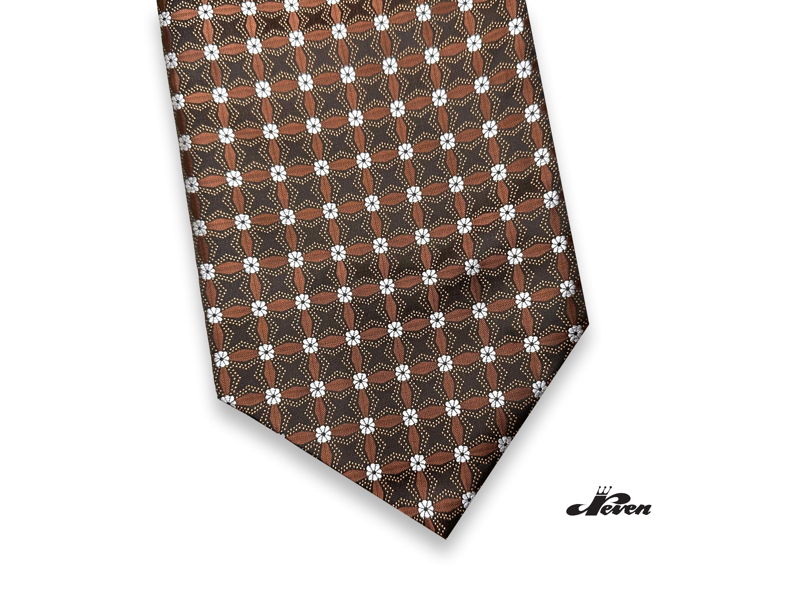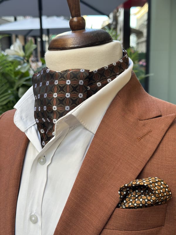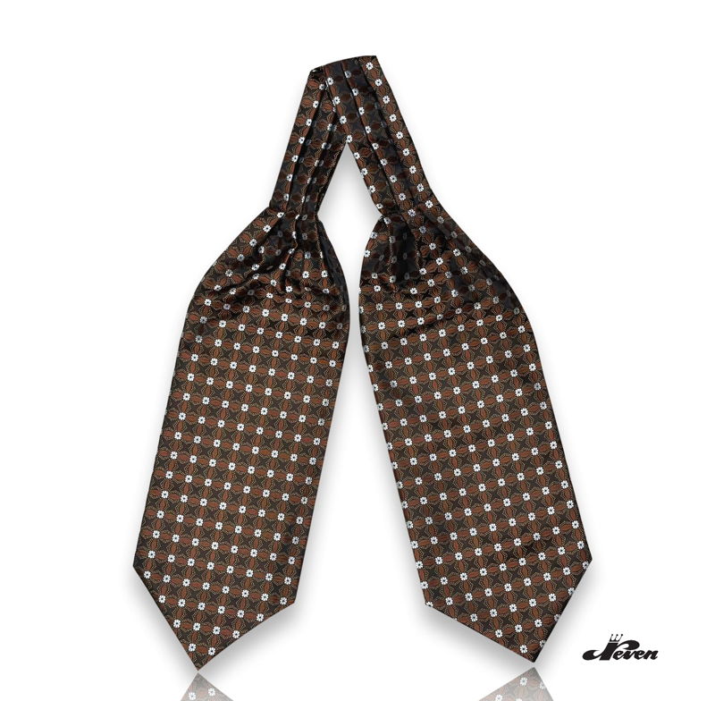 Tamno braon askot kravata sa sitnim svetlo sivim stiliziranim cvetićima i braon geometrijskim dezenom. Askot kravata je ručno rađena, materijal je vš. svila.