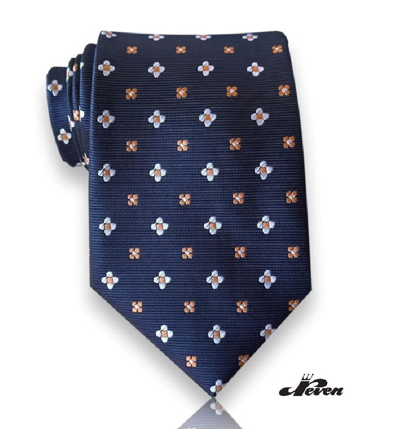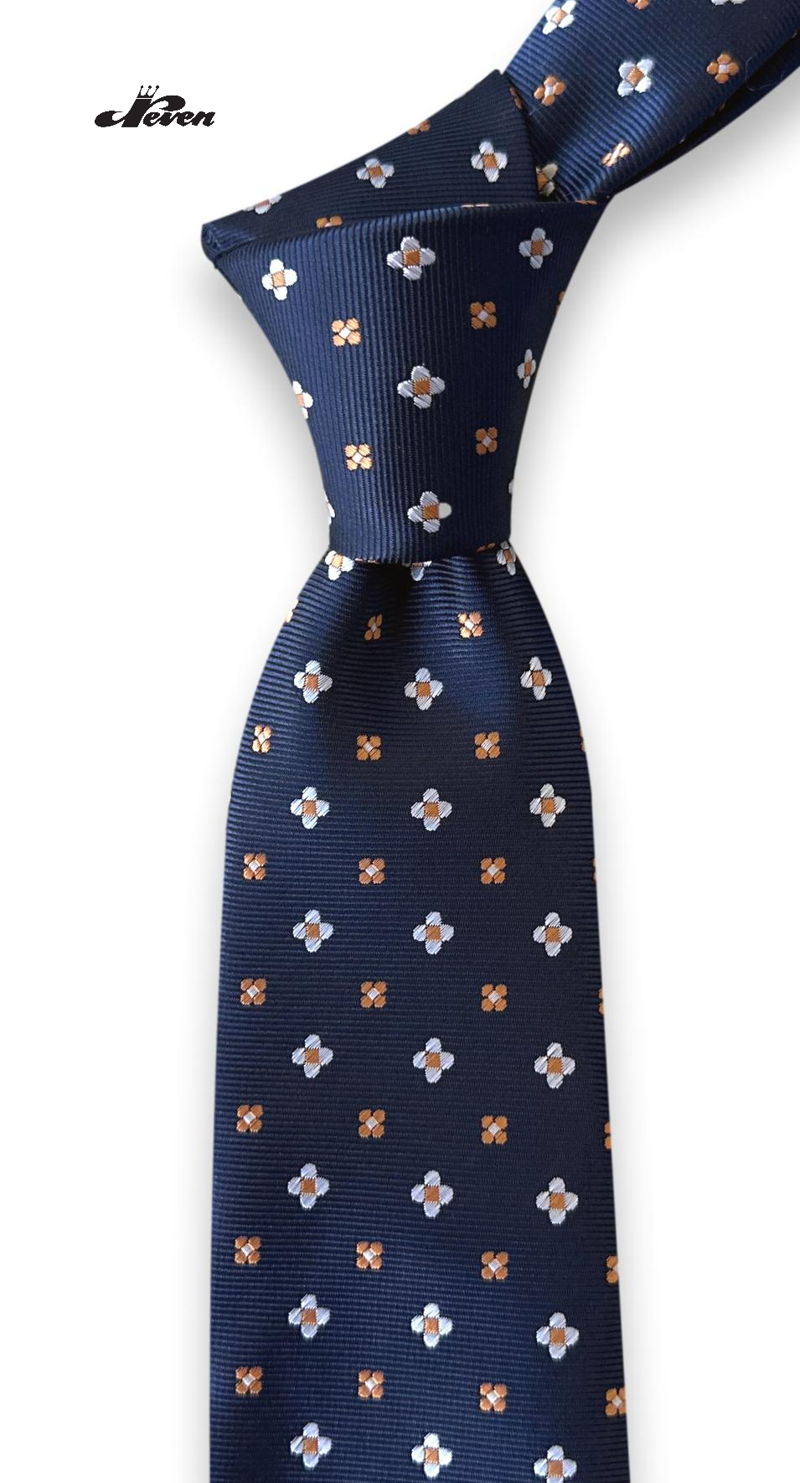 Teget kravata sa svetlo narandžastim i belim stilizovanim cvetnim dezenom. Kravata je ručno šivena, materijal je mikrofiber. Dimenzije kravate: 148cm x 8 cm